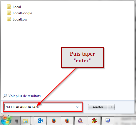 2. Dans la barre de recherche tout au fond, taper “%LOCALAPPDATA%”