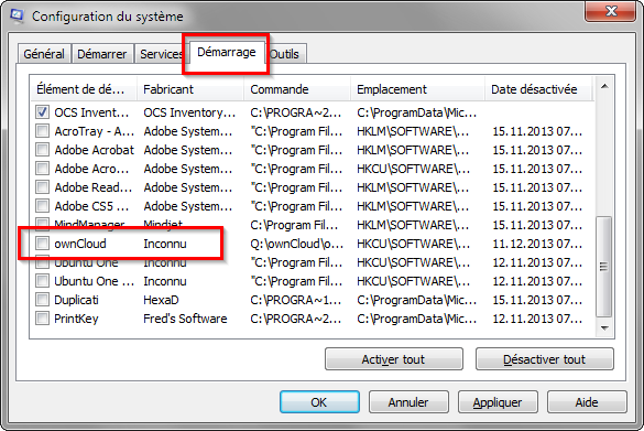 3. On va dans l'onglet “Démarrage” (et pas “Démarrer”), et là on cherche un ligne “owncloud” et si elle est cochée, on la décoche.