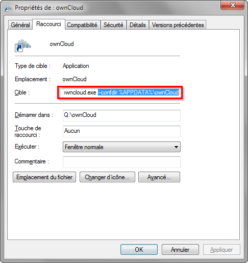 4. Il y a un champ qui s'appelle “Cible” qui contient le chemin vers le owncloud.exe, par exemple C:\Programmes\Owncloud\owncloud.exe