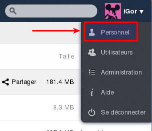 Une manière simple d'obtenir les bonnes informations concernant son système, est d'aller sur l'interface Web de l'installation d'Owncloud (serveur), en l'occurrence celle d'id-libre : https://id-libre.org/cloud, de s'y connecter et d'aller dans le menu à droite et choisir “personnel” :
